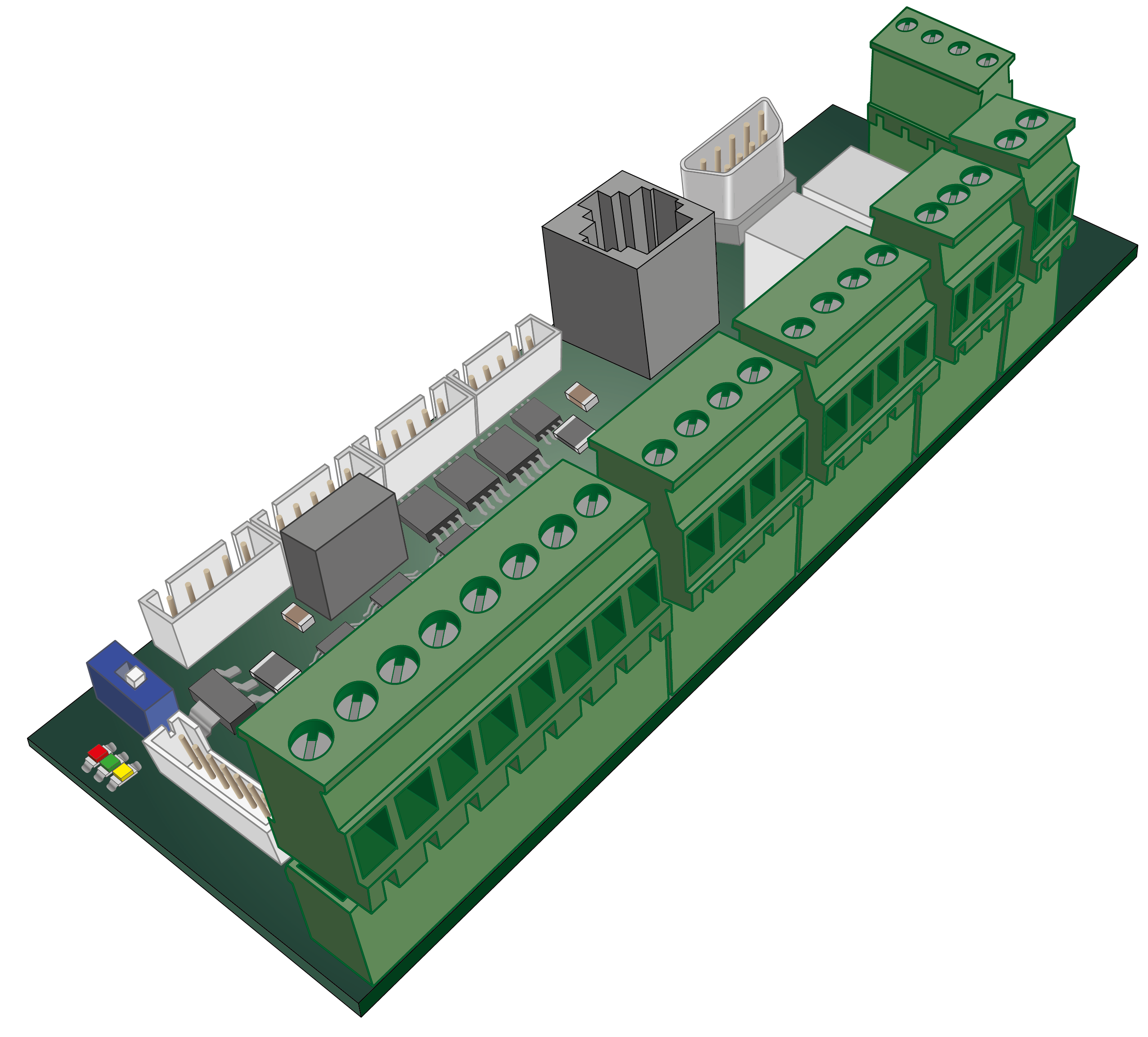Ingångsspänning 18-28 V DC Ingångar och utgångar 8 IO + 4 ingångar Ingångsström på varje IO 24 VDC / 8 mA Matningsspänning 22-28 V DC Maximal utgångsström på varje IO 200 mA Maximal utgångsström för kort 500 mA Mått H:50 x W:140 x D:35 mm Strömförbrukning i standby-läge 25 mA 24 VDC -