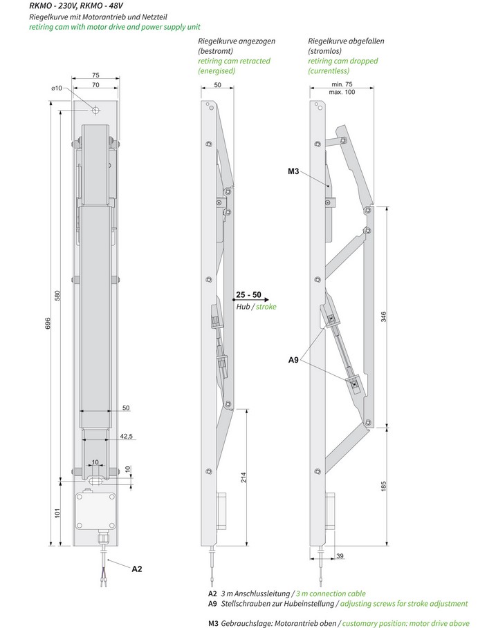Aktiveringskraft 65 N Anslutningskabel 3 m anslutningskabel, 2 x 1 mm² Arbetscykel ED 100 % Matningsspänning 100 V - 250 V AC eller DC (likriktad växelspänning) Max strömförbrukning Max. 0.4 A vid 230 V AC Omgivande lufttemperatur -10° - +45° °C Slaglängd 25 - 50 mm Standardposition Vertikal, motor ovan Skyddsklass IP20 Total höjd Strömförsörjd / indragen 50 mm - strömlös / fallen 75 - 100 mm justerbar Vikt 2.9 kg -