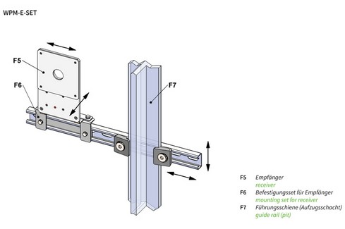 WPM-systemet används för styrning av motoriserade karmlås och överför energi från sändaren på korgen till mottagaren i schaktet för att låsa upp den tillhörande schaktdörren med denna energi.