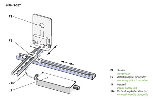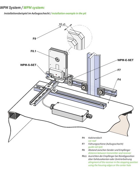 WPM-systemet används för styrning av motoriserade karmlås och överför energi från sändaren på korgen till mottagaren i schaktet för att låsa upp den tillhörande schaktdörren med denna energi.